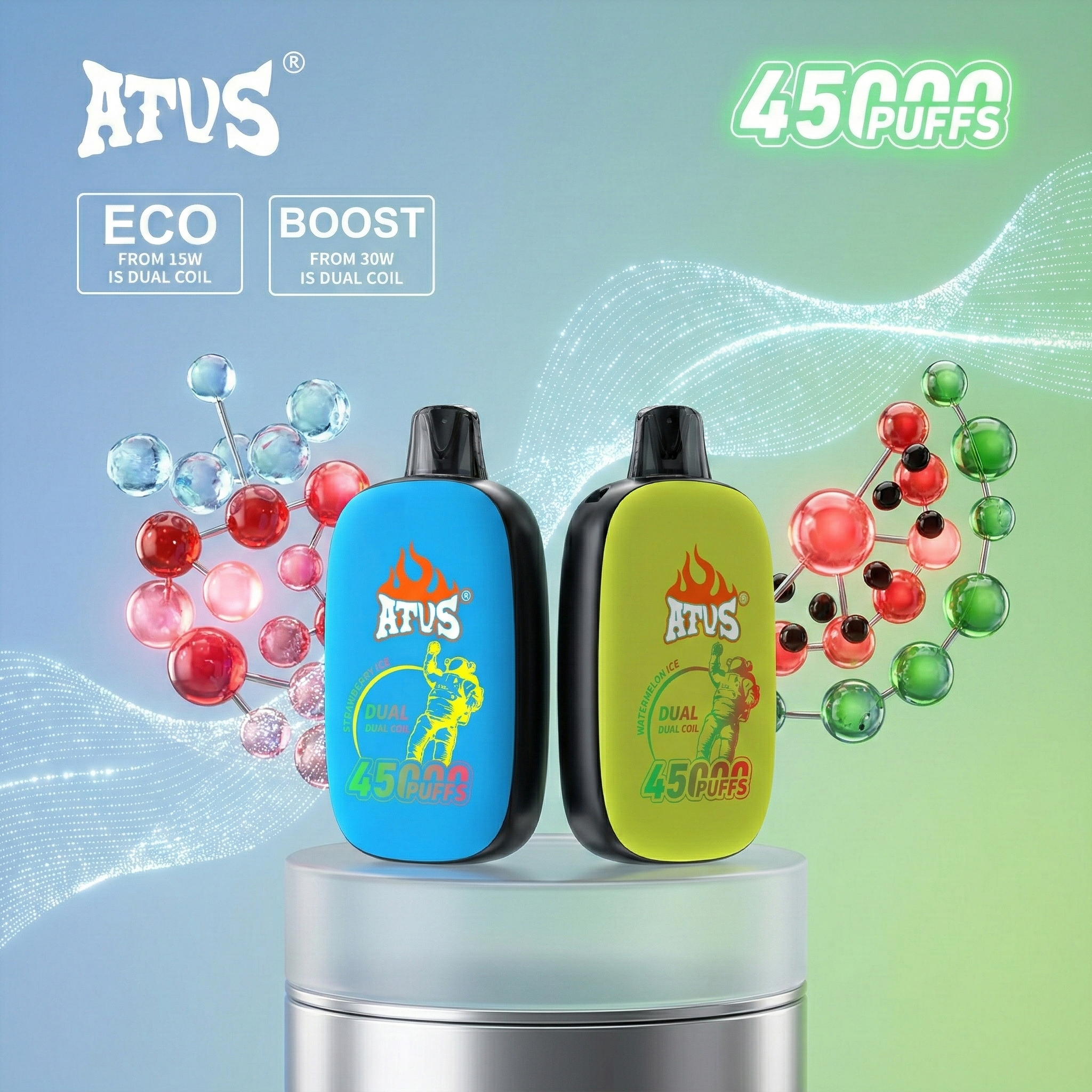 At the core of the ATVS 45000 Puffs lies dual mesh coils, designed to heat e-liquid evenly and efficiently. This technology unlocks the full flavor of each blend, eliminating harsh hits and burnt notes, so every draw feels smooth and satisfying. 💪