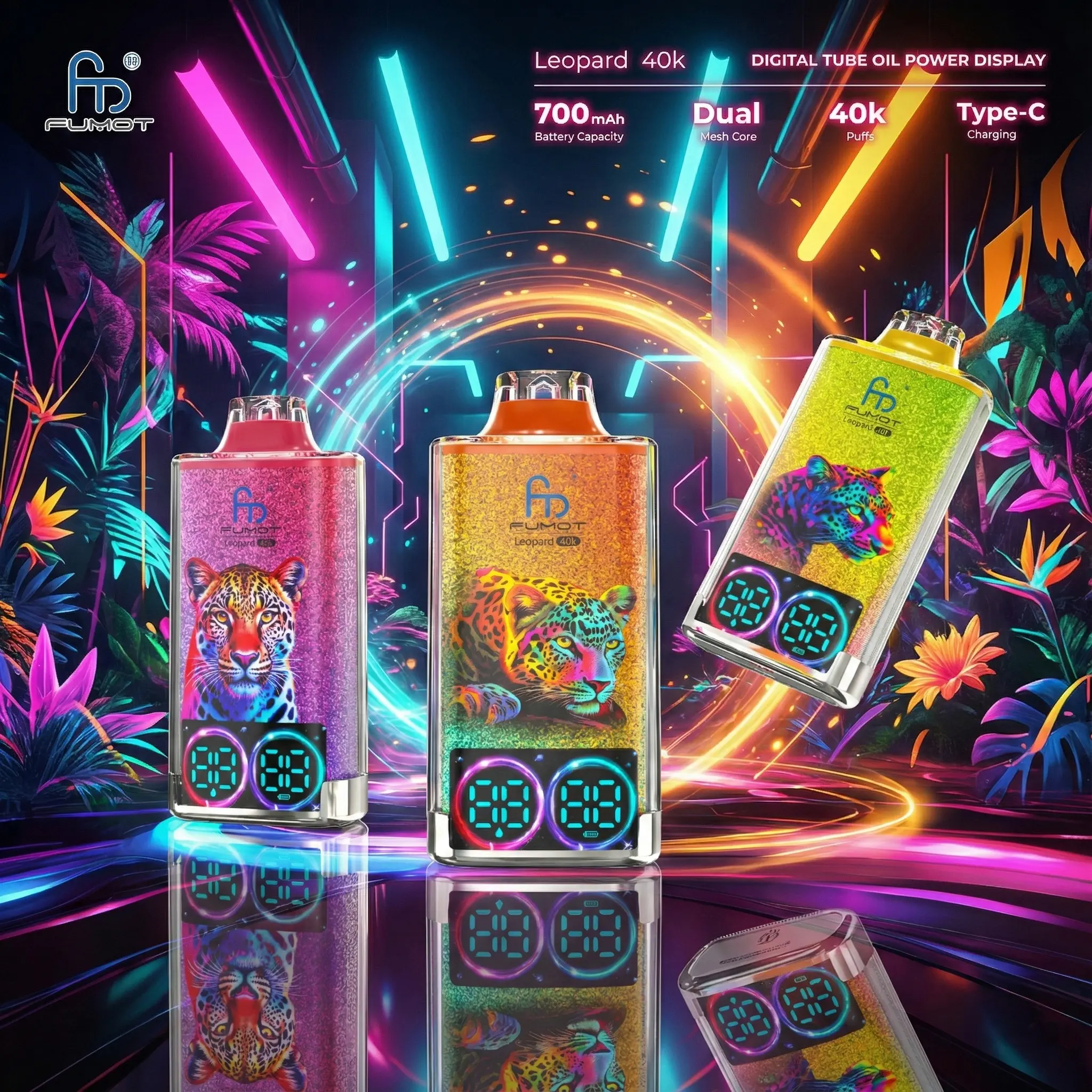 Fumot Leopard 40000 Puffs disposable vape Boasting 16 delightful flavors, dual mesh coils, and a 700mAh battery, it delivers 40K smooth puffs. Pick 2%-5% nicotine, track oil/power via the digital display, and charge easily with Type-C—reliable and hassle-free for flavor lovers.