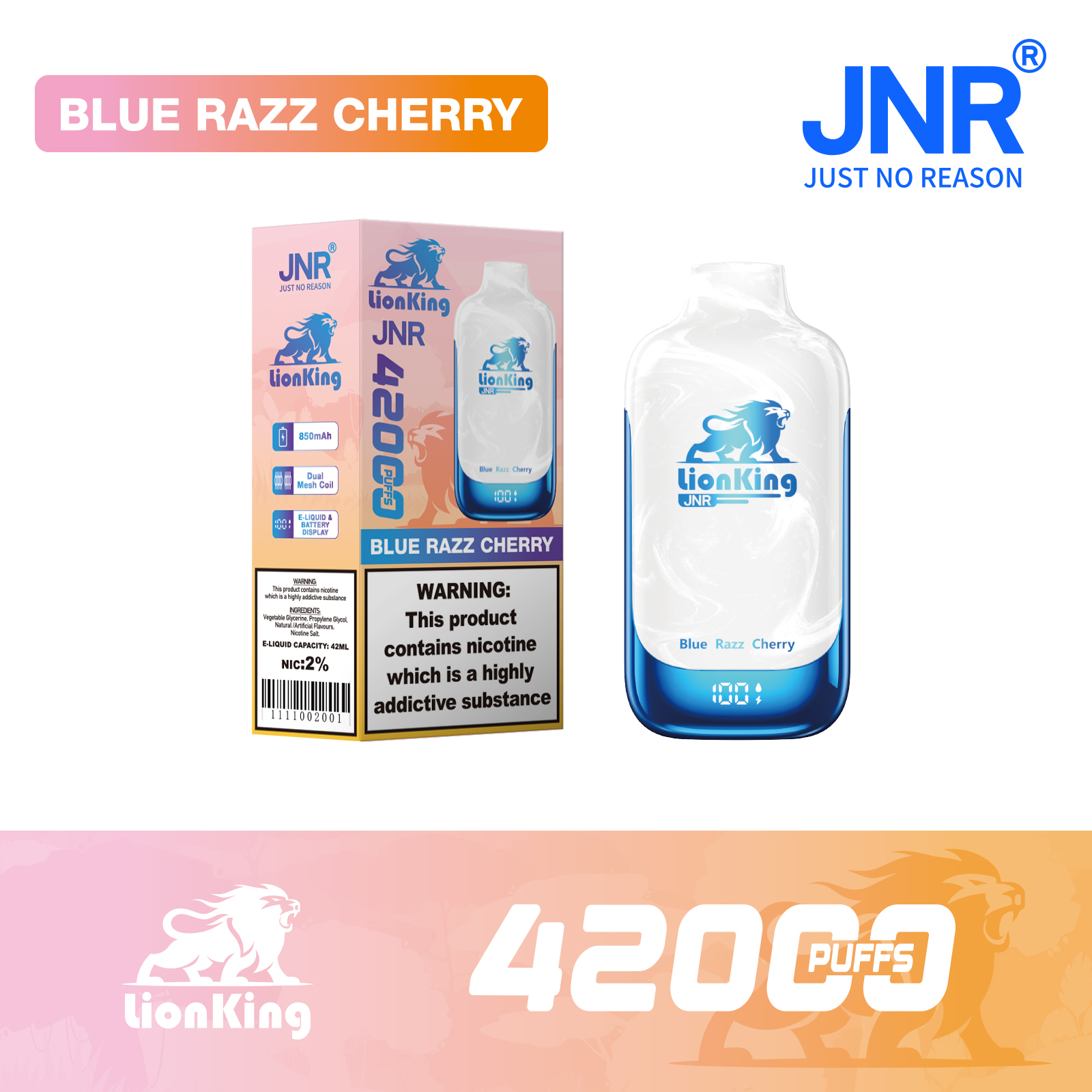 The JNR LionKing 42000 Puffs solves common pain points for vapers. Its 42ml e-liquid capacity and 42000 puff count mean you won’t have to replace or refill the device constantly — it’s reliable for long trips, busy workweeks, or lazy weekends. The dual mesh coil stands out too; it heats evenly to unlock every note of your chosen flavor, so you get a smooth hit every time, no harshness or burnt taste.