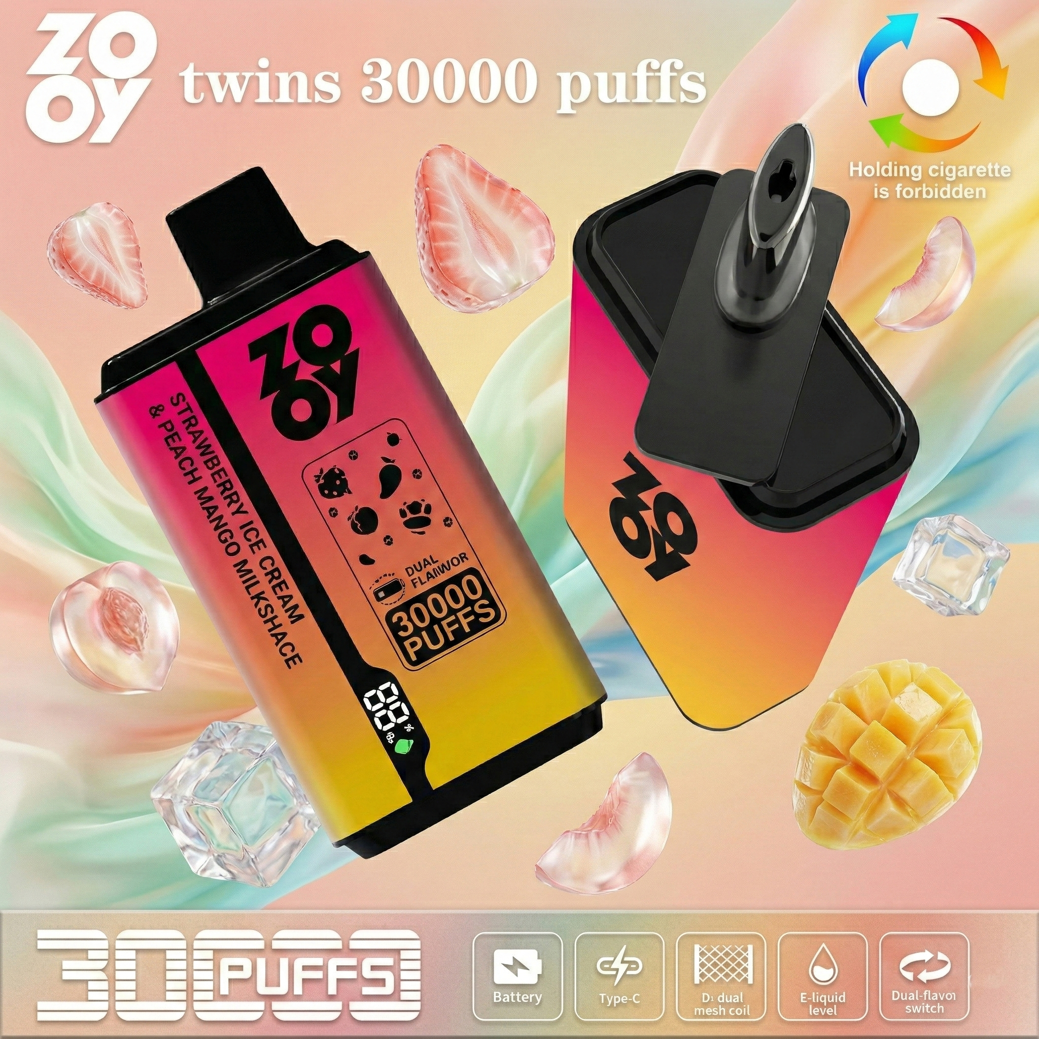 Zooy Twins 30000 Puffs offers 10 dual flavor pairs with free switching, 30000 puffs, and a double mesh coil. It has a 35ml e-liquid capacity, 650mAh Type-C rechargeable battery, smart display, and 2%/3%/5% nicotine options, all in a 130g compact body.